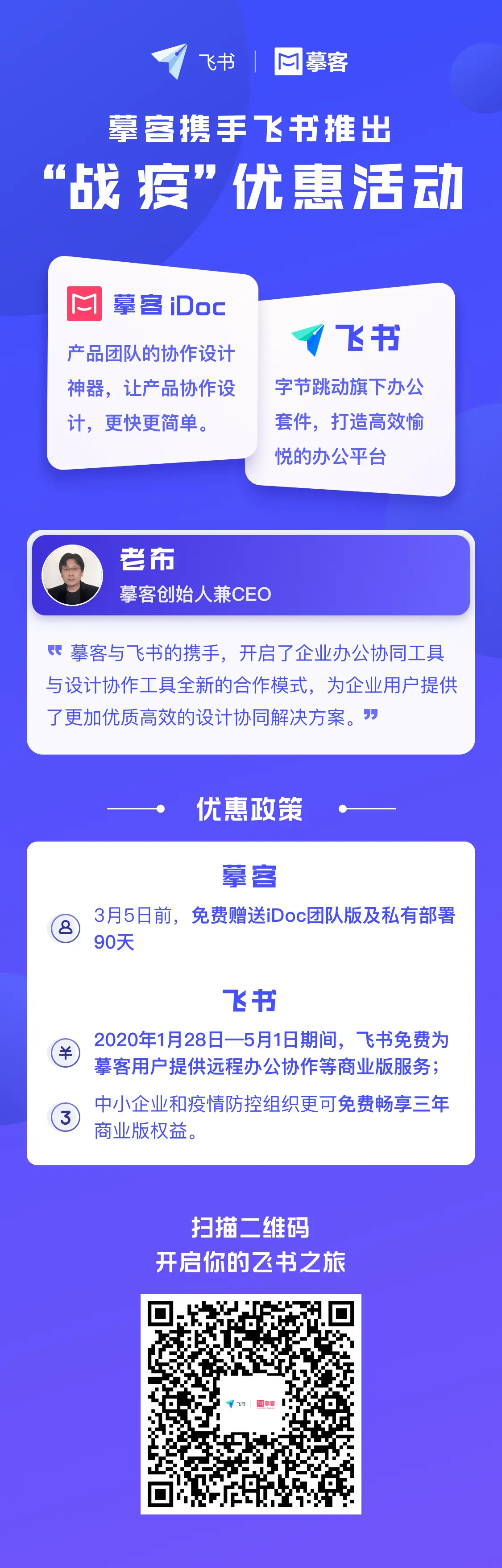 为帮助延迟复工的企业渡过难关,更加高效地开展远程办公,摹客携手飞书联合推出了“战疫”优惠活动: