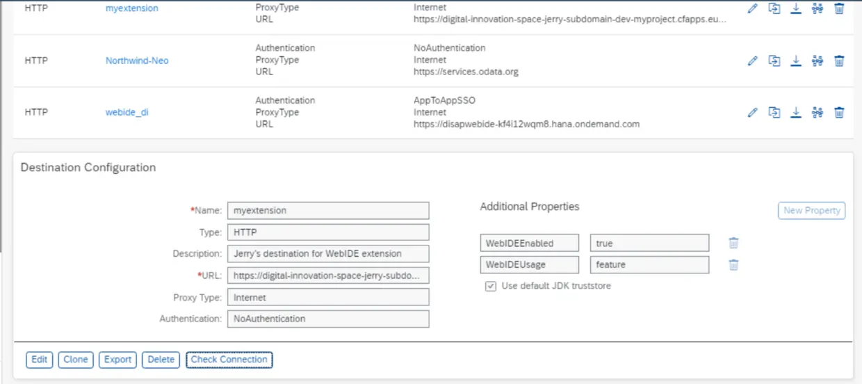WebIDE只会解析Neo环境里创建的Destination,此处还要给Destination维护WebIDEEnabled和WebIDEUsage两个额外属性: