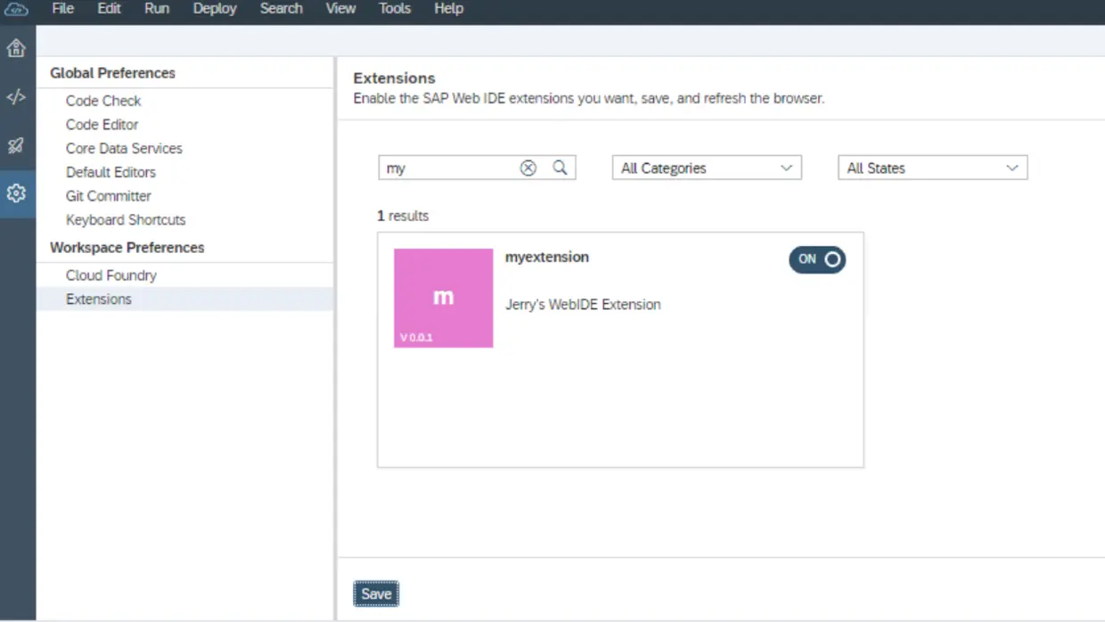一切就绪后,在Workspace preference的Extensions菜单里,就能搜索出我们部署好的WebIDE extension,