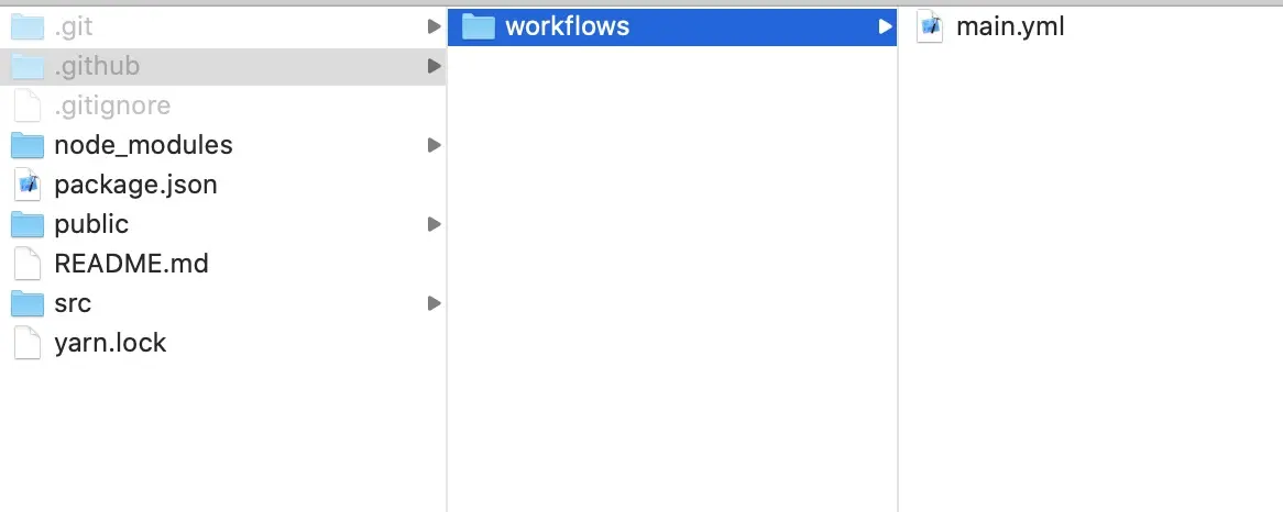 在项目路径下新建.github文件夹,然后在.github下新建workflows文件夹,在此文件夹下新建main.yml。main.yml就是一个action,我们利用它实现在代码推送触发项目构建