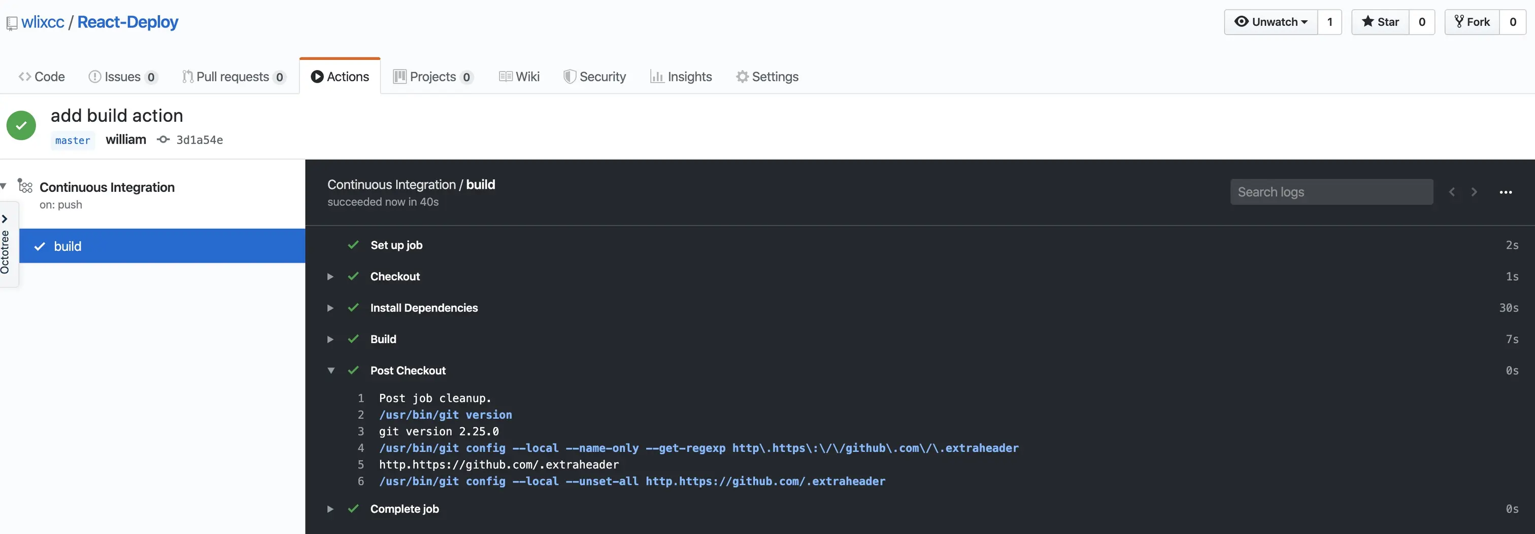 run: yarn build5. 现在已经完成action的编写,我们为项目添加remote,提交并推送到github上 。在github上打开仓库,我们可以看到github已经执行了第一个action