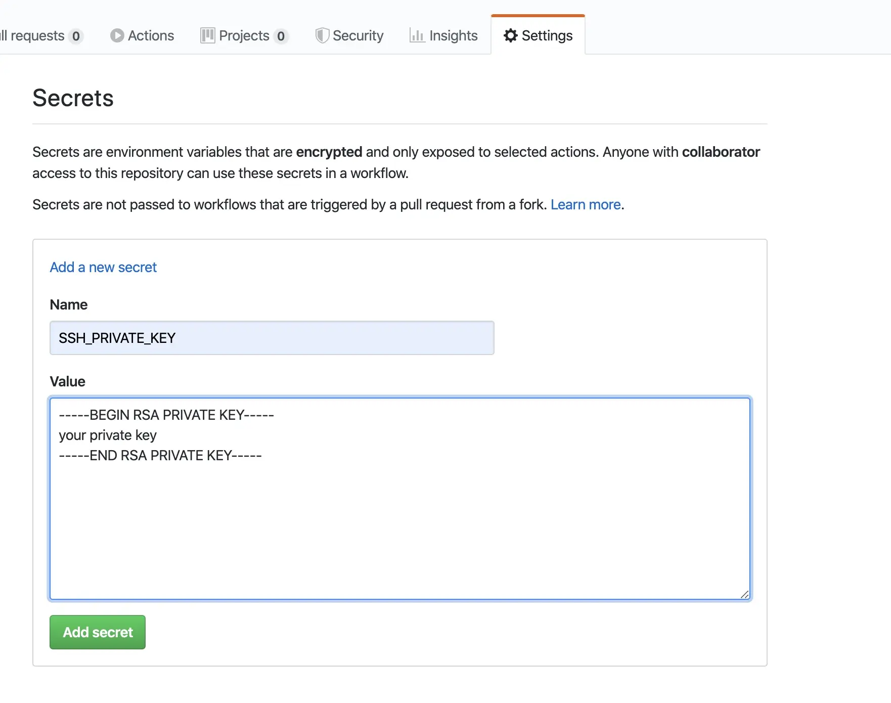 6. build之后我们需要把build好的文件上传到服务端 ,这里使用sftp,我们需要一些访问服务器的基本信息比如 ssh_private_key ,为了安全,不能直接把key写到action中,我们在settings/secrets添加信息。添加完成后,你可以在action中引用。