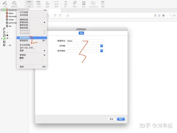之后使用navicat连接上自己的远程数据库,按照下面步骤创建一个名为djtest的数据库