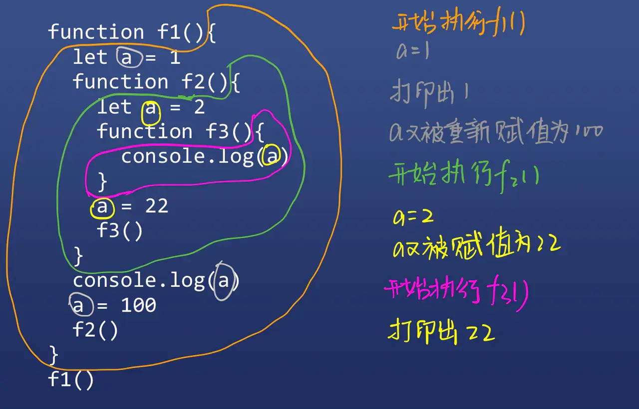 - 如果多个作用域有同名变量a,那么查找a的声明时,就向上看取最近的作用域(自己身处的那个作用域当然是最近的,没有再向上找最近的作用域),简称「就近原则」。查找a的声明的过程(也相当于作用域的范围)与函数执行无关,但a的值与函数执行有关