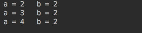 void func0() { static int a = 1; a++; printf("a = %d\t", a); int b = 1; b++; printf("b = %d\n", b); } int main() { for (int i = 0; i < 3; ++i) { func0(); } return EXIT_SUCCESS; }