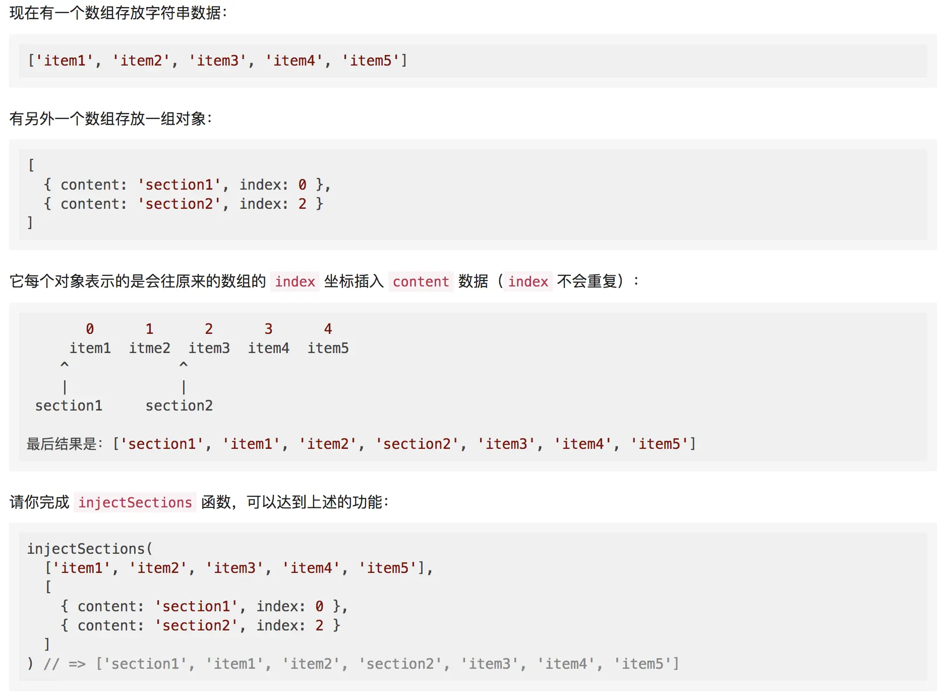 let arr2 = [{content:'section1',index:0},{content:'section2',index:2}];