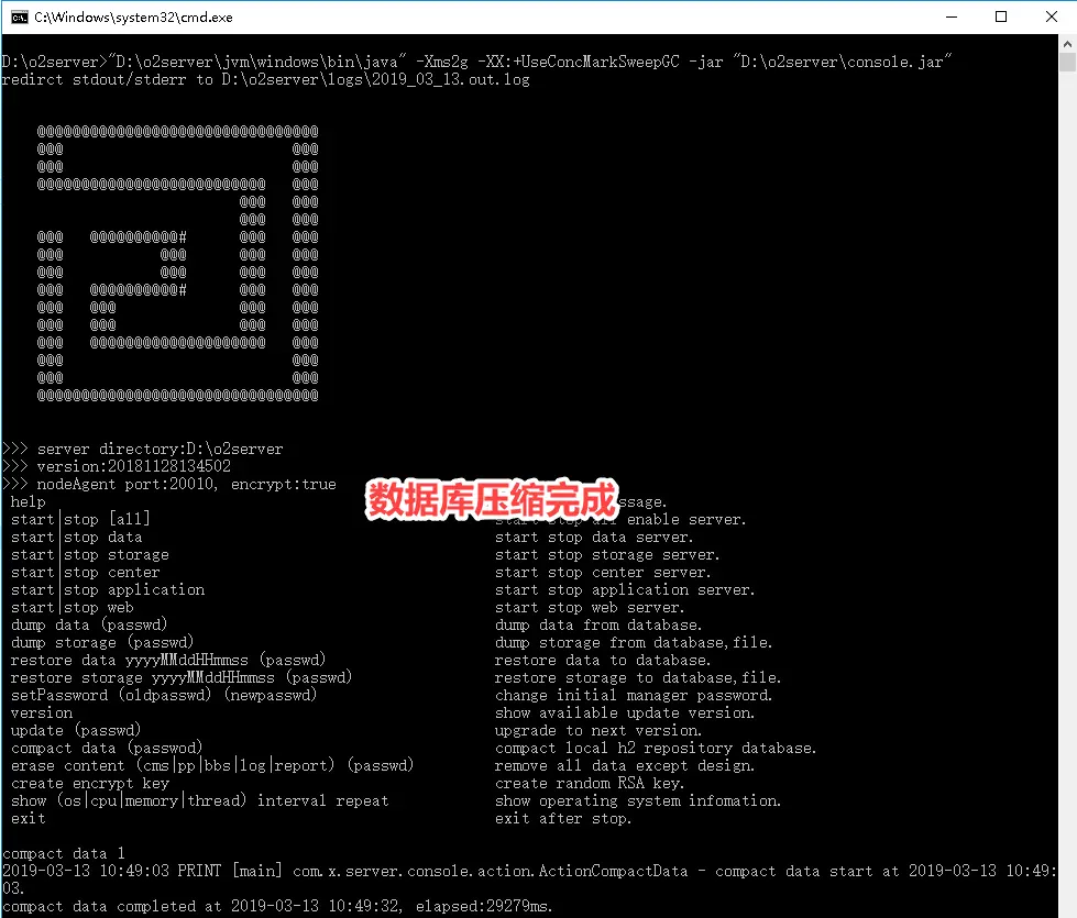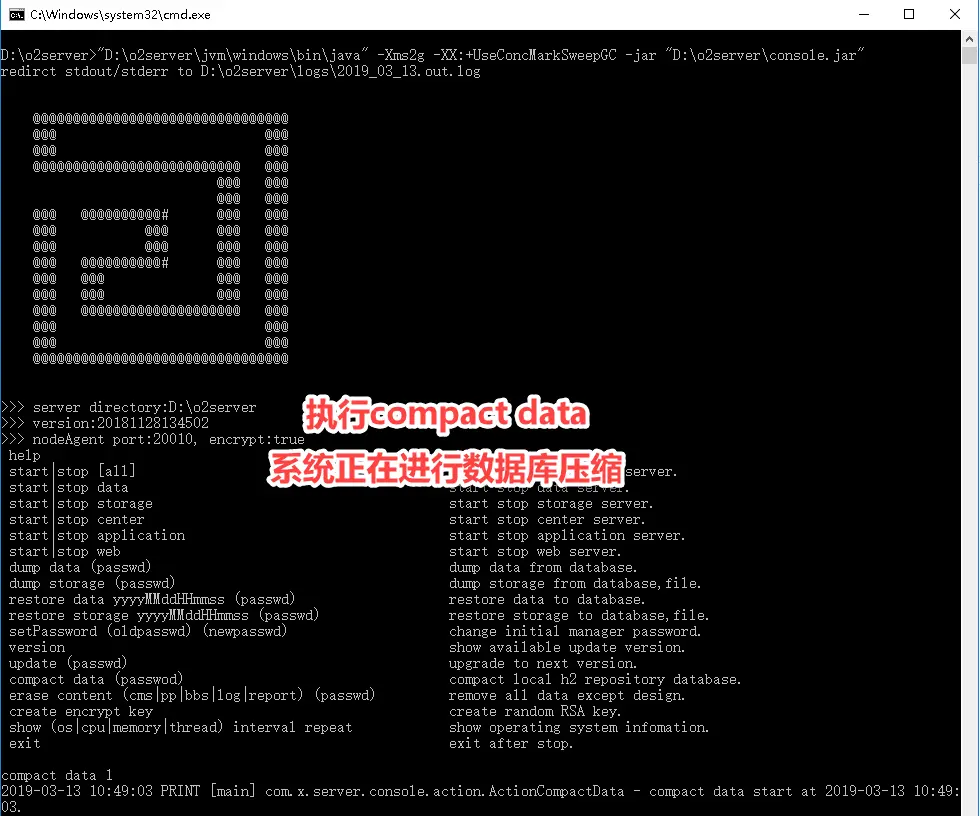 平台自带的H2数据库在使用过程中会随着数据量的增加而增长,但是并不会在删除数据后自动缩小。 所以O2OA提供了数据库压缩命令用于缩小数据库占用的空间。