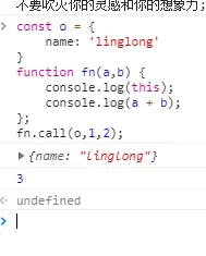 call的第一个参数是一个对象,函数中的this指向这个对象,后面的参数就是传递到函数中的各种各样的参数。fn函数定义在全局中,我们通过call(o,1,2)让函数调用时候的this变成了o,执行函数结果为3.控制台打印的结果如下图所示。