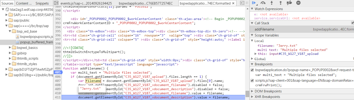 使用Chrome debug attachment upload page:从local laptop上选择一个file之后,断点触发: