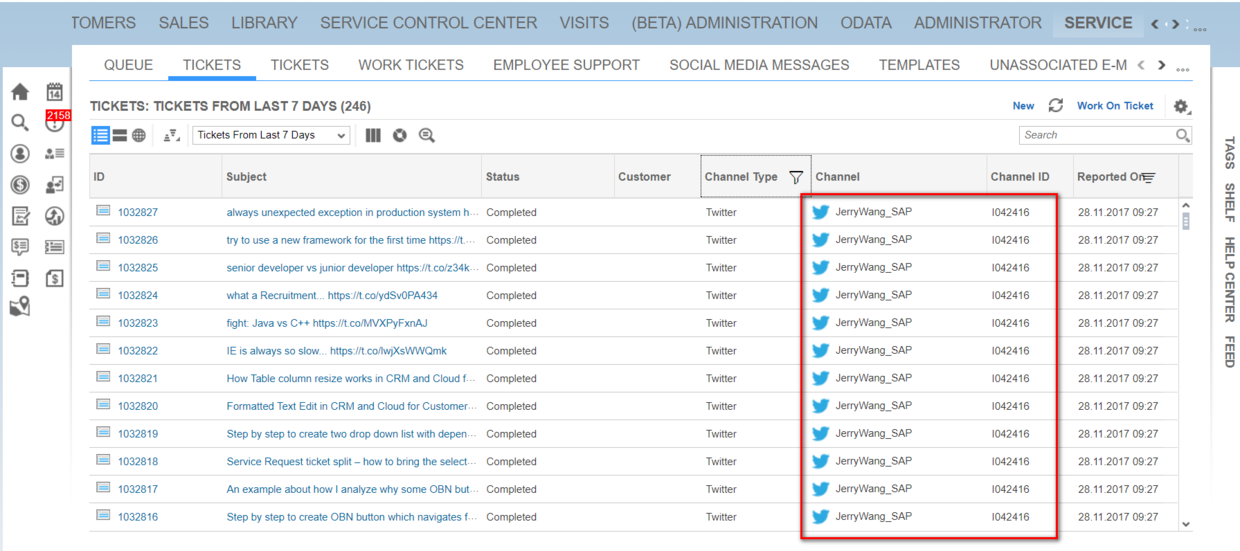 该job会将Twitter website里consumer key指向的twitter account发布的所有twitter抓到C4C来自动生成service request: