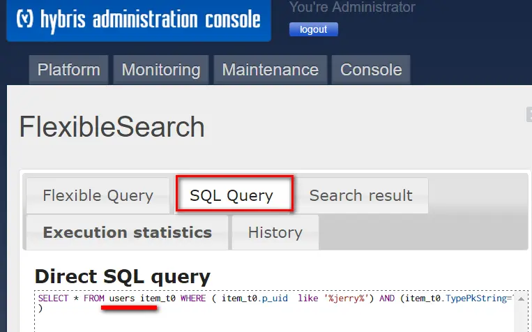 查看flexible query对应的SQL语句,发现select from里用到的{customer}被翻译成了真正的数据库表user. 大括号里定义的customer在hybris里称为code