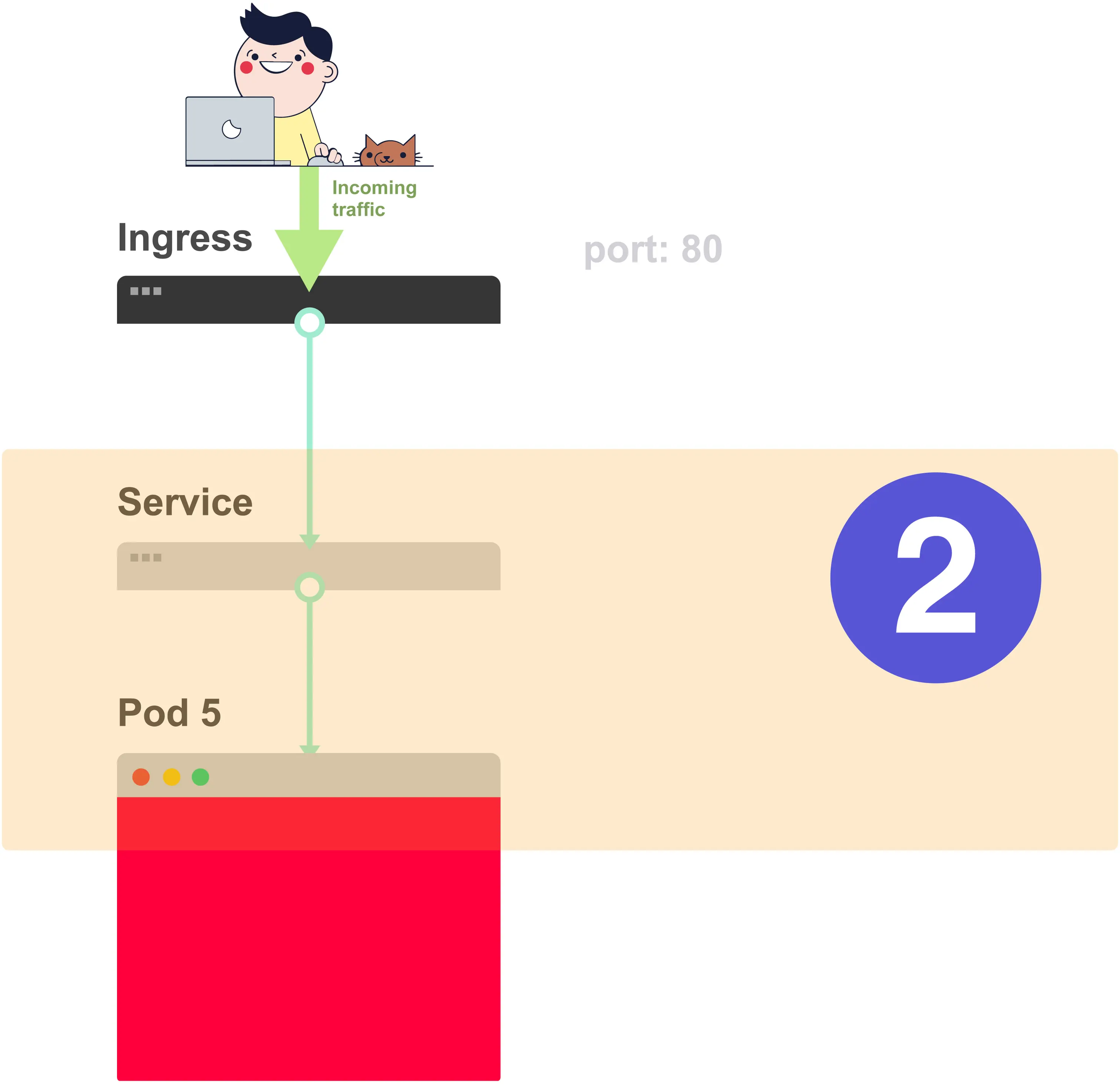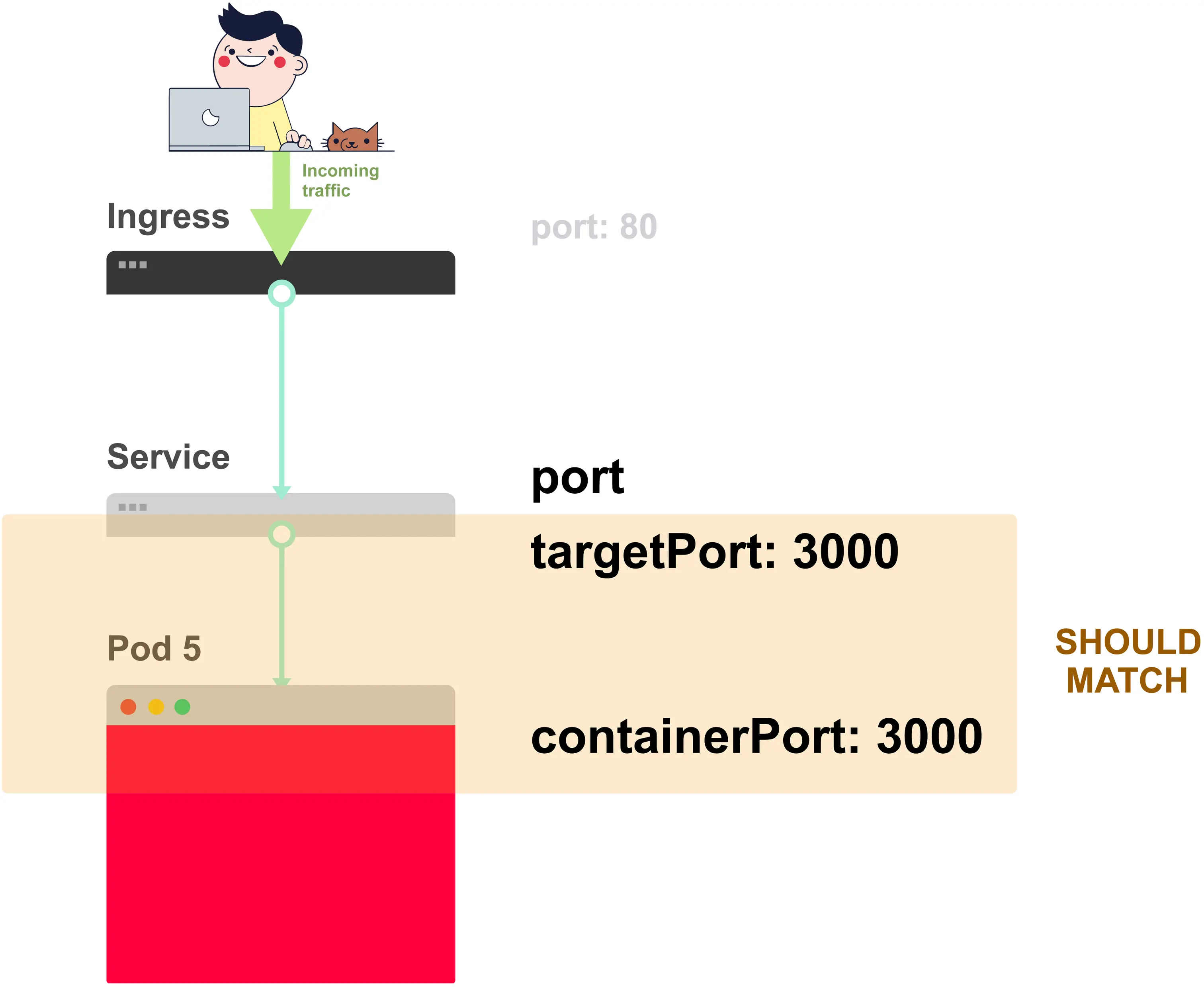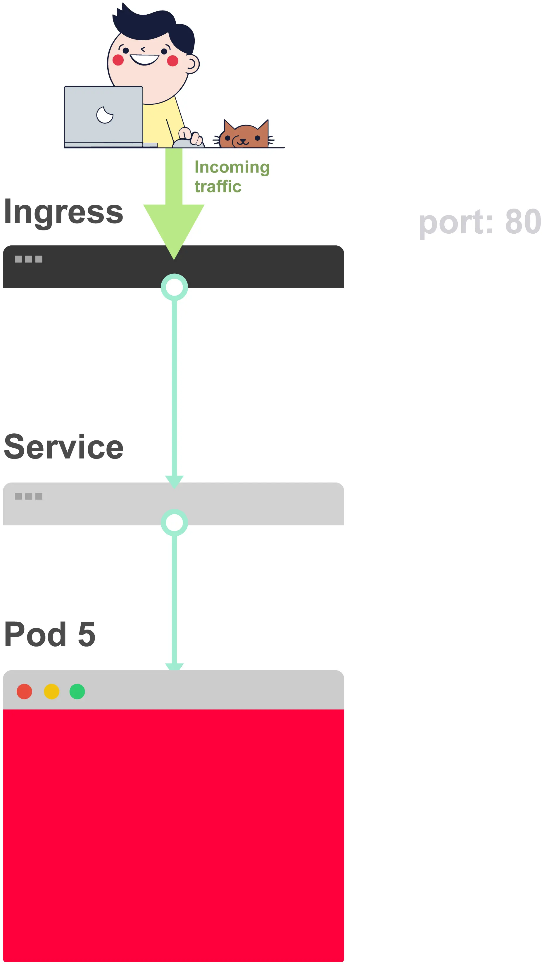 你应该永远记住以从下至上的顺序解决问题:现检查Pod,然后向上移动堆栈至Service和Ingress。