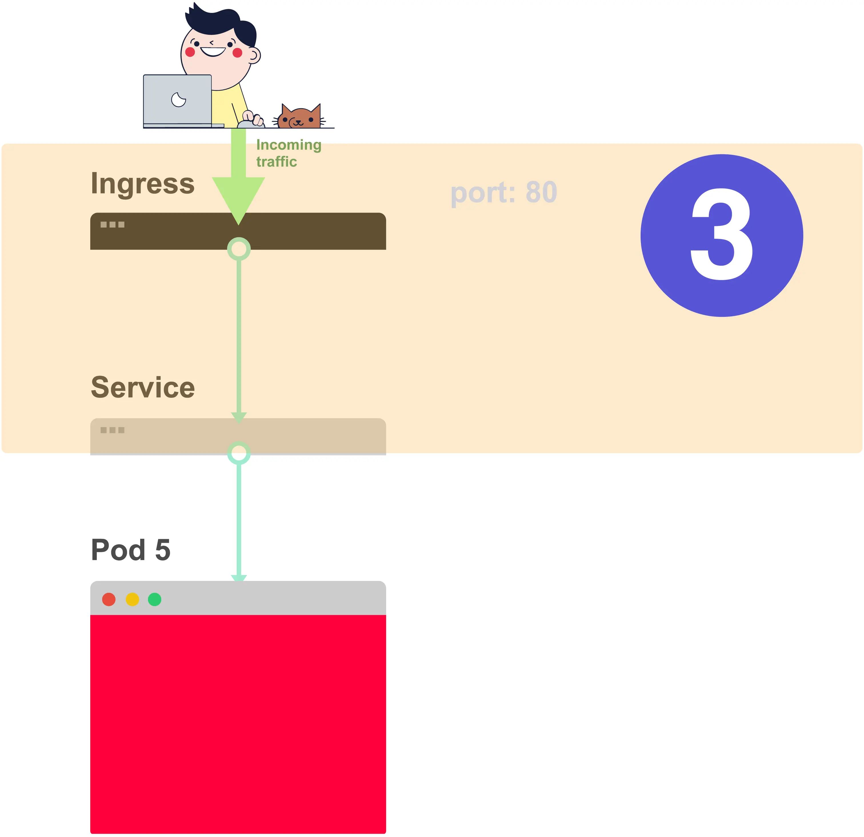 暴露应用程序的下一步是配置Ingress。Ingress必须知道如何检索Service,然后检索Pod并将流量路由到它们。Ingress通过名称和暴露的端口来检索正确的Service。