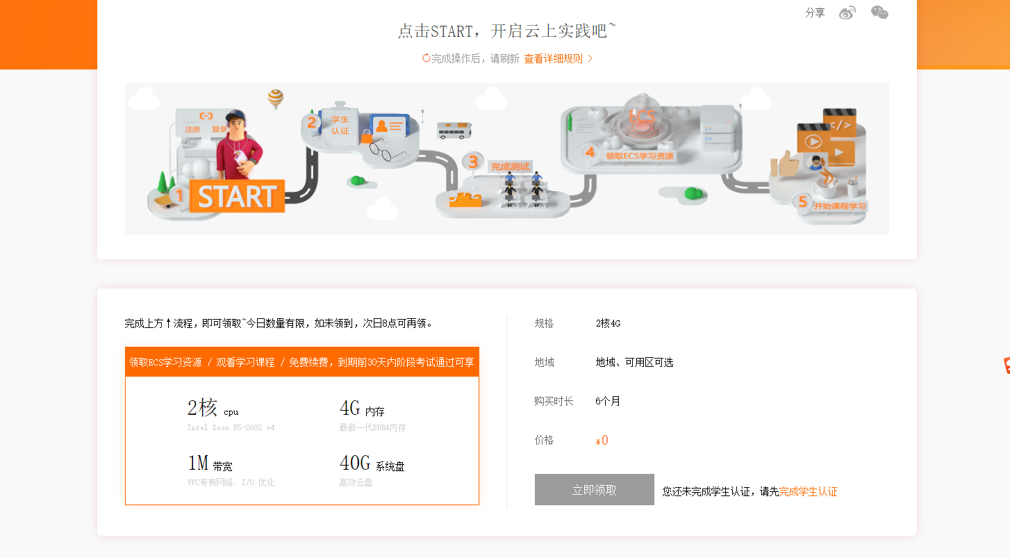 - 领取服务器资源 (领取6个月内有效,服务器ECS到期释放前30天内,可登录个人中心,参加阶段性学习考试,测试通过,可免费续期1次,时长为6个月)累计白嫖时长1年。