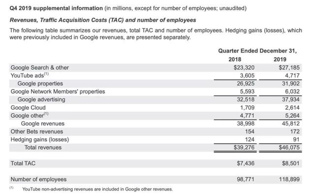 谷歌母公司 Alphabet 2019 第四季度财报,也是首次公开谷歌云的业绩: