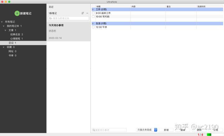 和印象笔记一样,总共分成三栏,最左边是笔记本列表,中间是笔记列表,最右边是一个富文本编辑器,状态栏的 0 / 0表示待办事项的完成情况,即总共有0个待办,0个已完成事项。待办事项点击之后如下图所示。