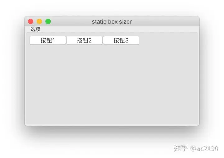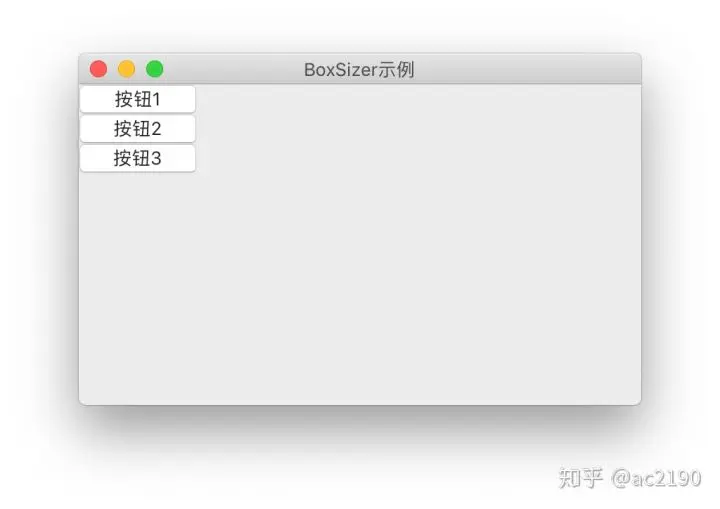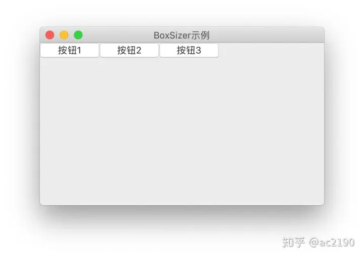 BoxSizer可以将组件一起排列在同一列或者同一行,例如可以使用BoxSizer将三个按钮排成一行,如下所示。