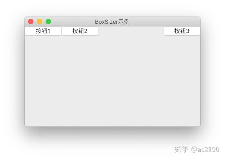 如果我们需要将第三个按钮向右对齐,因为第三个按钮是属于水平布局器里面的一个组件,所以直接添加wx.ALIGN_RIGHT 是没有效果的,我们需要添加一个空白组件将第三个按钮挤压到最右边。使用AddStretchSpacer方法可以添加一个默认比例 为1的空白组件,上述代码修改为: