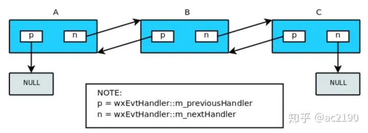 通过使用wx.EvtHandler.SetNextHandler和wx.EvtHandler.SetPreviousHandler方法可以建立事件处理双向链表, 如图所示。