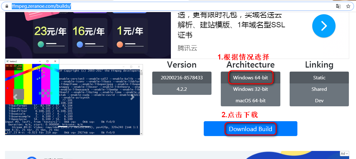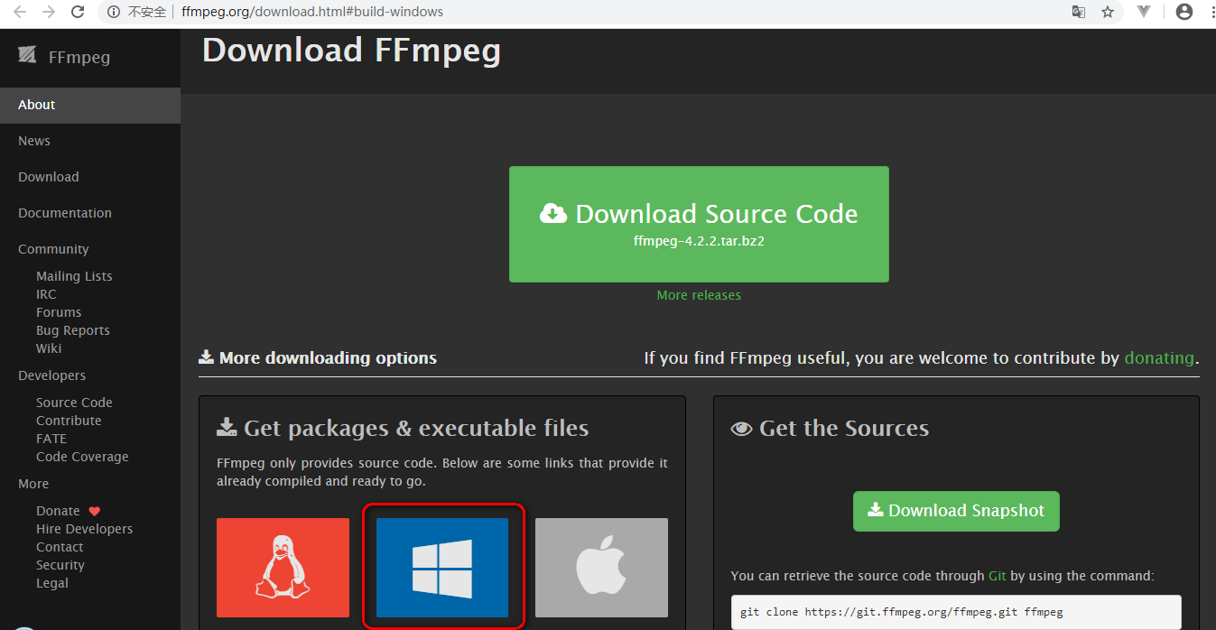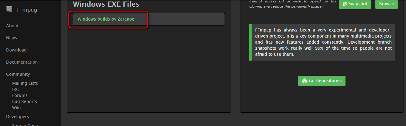 点击 “Windows builds by Zeranoe ”进入 Windows 的 FFmpeg 的下载页面:ffmpeg.zeranoe.com/builds/