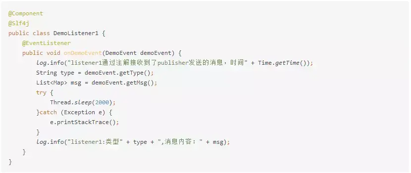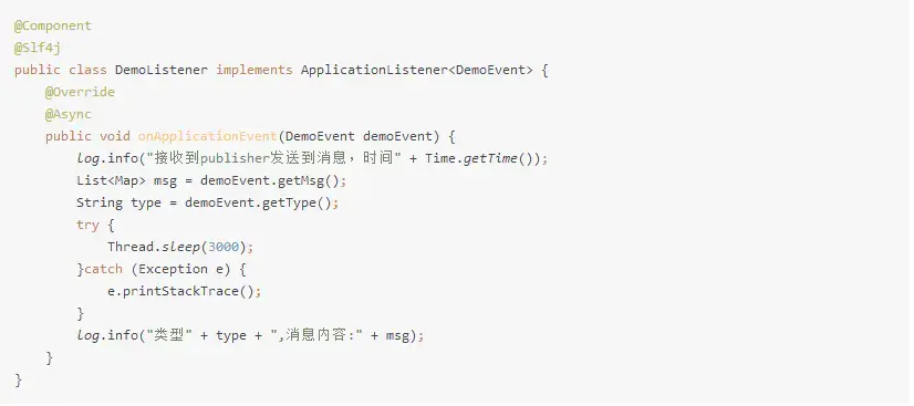 2019-07-21 10:42:41.697 INFO 1756 --- [cTaskExecutor-1] com.guanjian.lanmda.event.DemoListener : 接收到publisher发送到消息,时间10:42:41