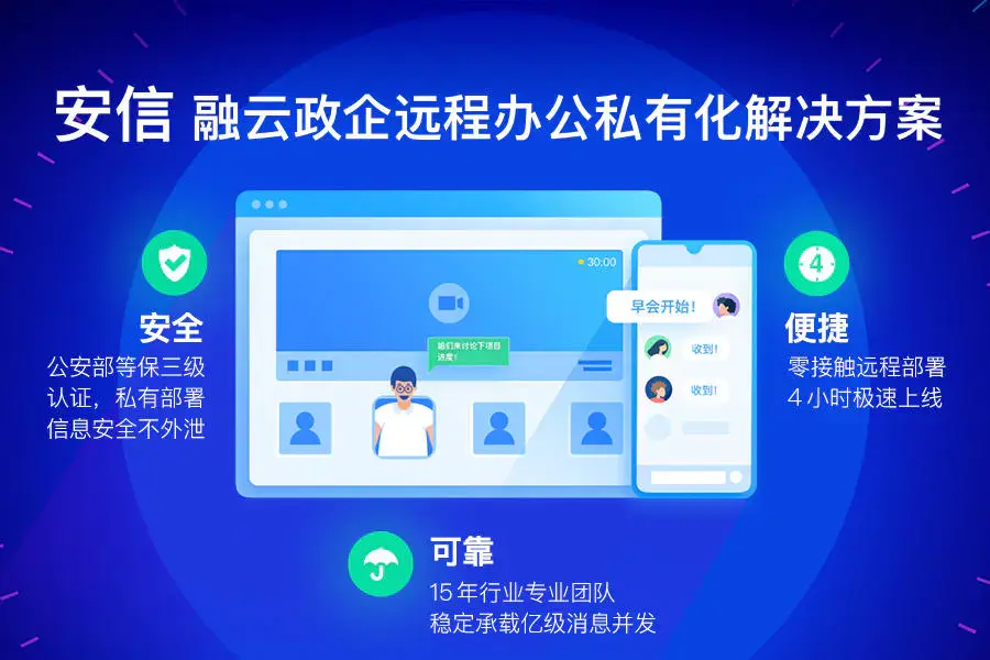 然而,不同于我们日常的聊天发消息,政企机构对于远程办公的安全可靠性有着极高的要求。如何让他们快速部署上线并使用?远程办公软件又如何来保障业务往来中的信息安全?面对此类用户高标准的办公需求,融云特别在疫情期间推出了政企远程办公私有化解决方案——安信,并宣布疫情期间开放免费试用,助政府机关及企业机构安全复工。