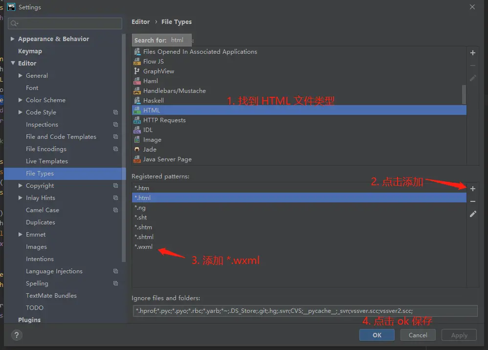 打开 webstorm 设置 > Editor > File Types,如下图所示,将 *.wxml 后缀文件配置成以 HTML 类型打开