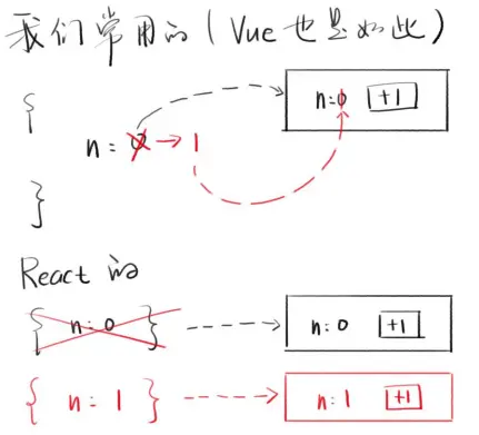 但是函数组件中的setN则完全不会沿用之前的属性,写入即覆盖,所以函数组件中如果有多个属性则建议使用展开语法复制之前的属性然后同名覆盖