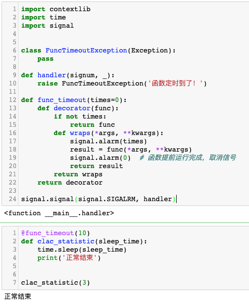 基于以上原理,我们实现一个装饰器,来简化为不同函数设置超时功能: