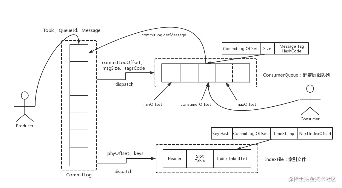 (3) IndexFile:IndexFile(索引文件)提供了一种可以通过key或时间区间来查询消息的方法。Index文件的存储位置是:HOME/store/index\{fileName},文件名fileName是以创建时的时间戳命名的,固定的单个IndexFile文件大小约为400M,一个IndexFile可以保存 2000W个索引,IndexFile的底层存储设计为在文件系统中实现HashMap结构,故rocketmq的索引文件其底层实现为hash索引。
