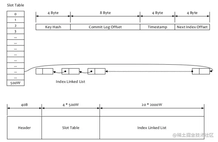其中的索引数据包含了Key Hash/CommitLog Offset/Timestamp/NextIndex offset 这四个字段,一共20 Byte。NextIndex offset 即前面读出来的 slotValue,如果有 hash冲突,就可以用这个字段将所有冲突的索引用链表的方式串起来了。Timestamp记录的是消息storeTimestamp之间的差,并不是一个绝对的时间。整个Index File的结构如图,40 Byte 的Header用于保存一些总的统计信息,4500W的 Slot Table并不保存真正的索引数据,而是保存每个槽位对应的单向链表的头。202000W 是真正的索引数据,即一个 Index File 可以保存 2000W个索引。