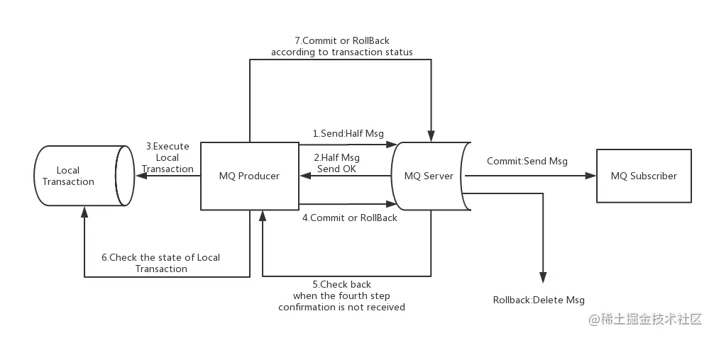 上图说明了事务消息的大致方案,其中分为两个流程:正常事务消息的发送及提交、事务消息的补偿流程。