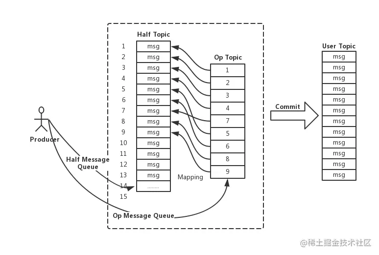 在执行二阶段Commit操作时,需要构建出Half消息的索引。一阶段的Half消息由于是写到一个特殊的Topic,所以二阶段构建索引时需要读取出Half消息,并将Topic和Queue替换成真正的目标的Topic和Queue,之后通过一次普通消息的写入操作来生成一条对用户可见的消息。所以RocketMQ事务消息二阶段其实是利用了一阶段存储的消息的内容,在二阶段时恢复出一条完整的普通消息,然后走一遍消息写入流程。