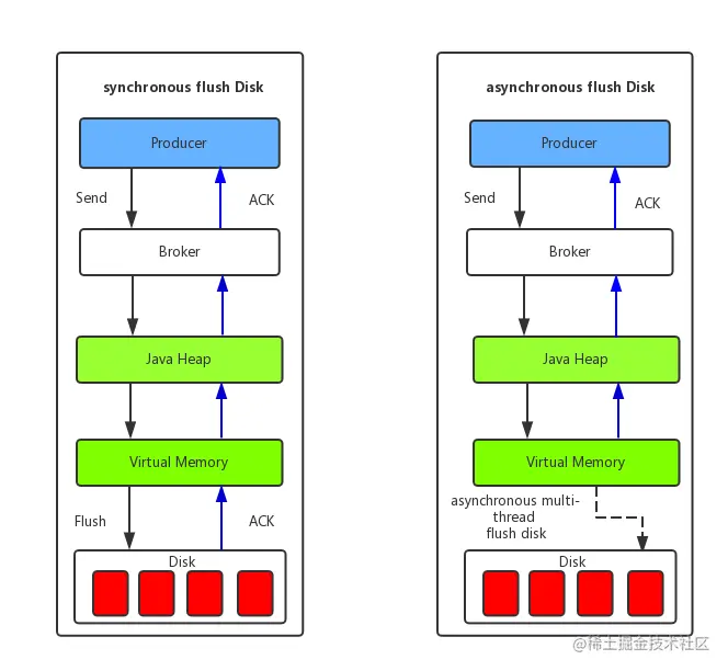 (1) 同步刷盘:如上图所示,只有在消息真正持久化至磁盘后RocketMQ的Broker端才会真正返回给Producer端一个成功的ACK响应。同步刷盘对MQ消息可靠性来说是一种不错的保障,但是性能上会有较大影响,一般适用于金融业务应用该模式较多。