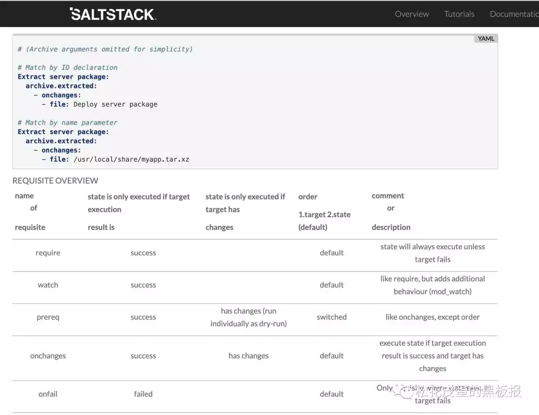 以下为SaltStack的PlayBook示例,可以通过order指定顺序,还可以通过require、watch、onchanges、onfail灵活设置依赖和触发任务。