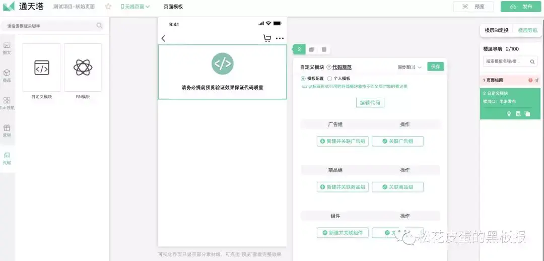 比如,京东通天塔平台提供了丰富的图文、商品、导航、营销模板,同时支持自定义代码生成自己的模板,从而让采销、运营、商家能快速和灵活地搭建营销活动页面。