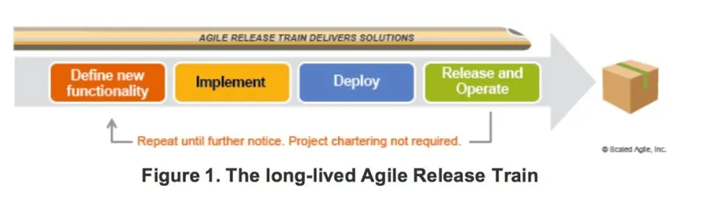 由敏捷团队、主要利益相关者及其他资源组成的一个项目群结构,被称为“敏捷发布火车(ART)”。 敏捷发布火车(ART)是典型的虚拟组织,它包含定义和交付价值所需要的所有人员; 具有定义、实现、测试、部署、发布和操作解决⽅案所需的所有能力(包括:软件、硬件、固件等其他能力)。ART的目的是通过⼀个明确的愿景、路线图和项目群待办事项列表,使管理层、团队和利益相关者向⼀个共同的使命保持协调⼀致。敏捷发布火车交付的是⼀个持续的价值流,如下图长期存在的敏捷发布火车: