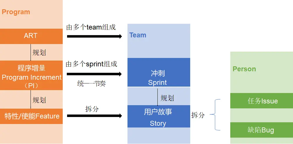 在项目群层,敏捷发布火车(ART)采用10-12周为一个发布周期。敏捷发布火车由多个冲刺组成,这一系列冲刺发布一个或多个项目群增量(PI)。ART可在每个PI迭代末设置一个特殊的IP冲刺,各团队可以提出PI过程中产生的问题、分析问题产生的原因,提出解决问题的方案,确定是否可放在接下来的PI计划中,以及为接下来的PI进行预计划。 项目群增量(PI)提供了⼀个更⼤的、更具有战略意义的PDCA时间盒,用来收集和评估系统级的绩效表现。它还为整列火车的跨领域计划、集成、演示、检视和调整(I&A)提供了节奏。PI的时间盒是固定的。敏捷发布火车上的所有团队都同步相同的PI长度(通常是8-12周),并且有共同的迭代开始/结束⽇期和持续时间。PI最常见的模式是四个开发迭代,加⼀个创新和计划(IP)迭代。 PI是针对ART的,而迭代是针对敏捷团队的。这是⼀个固定的时间段,用于构建和验证整个系统增量,所有敏捷团队保持同一开发进度,每个迭代都必须产出对迭代任务有价值的内容,在较短的周期内防止实现和迭代任务的偏离。一旦发现偏离,可以及时纠正。每个PI将节奏和同步应用于: