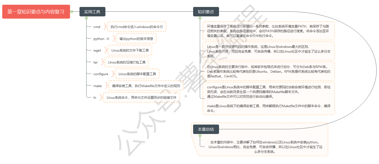 make是Linux系统下的编译安装工具,用来解释执行Makefile文件中的脚本命令,编译命令。1.3.4 本节内容知识脑图