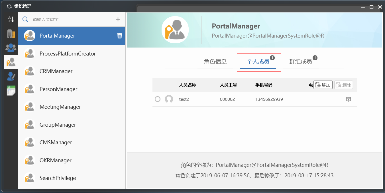 | PersonManager | 人员信息管理员 | 可以在组织管理-人员信息管理中对人员信息进行各类管理操作 |