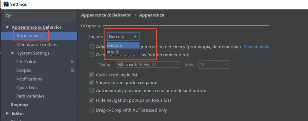 目前我的IDEA中有两套主题:Darcula, IntelliJ。