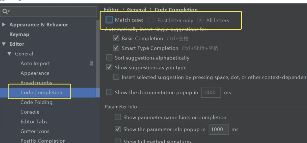 - IntelliJ IDEA 的代码提示和补充功能有一个特性:区分大小写。如上图标注所示,默认就是 First letter 区分大小写的。