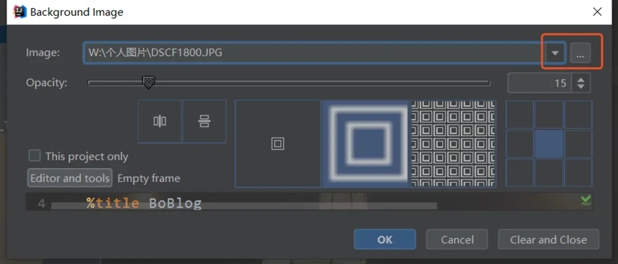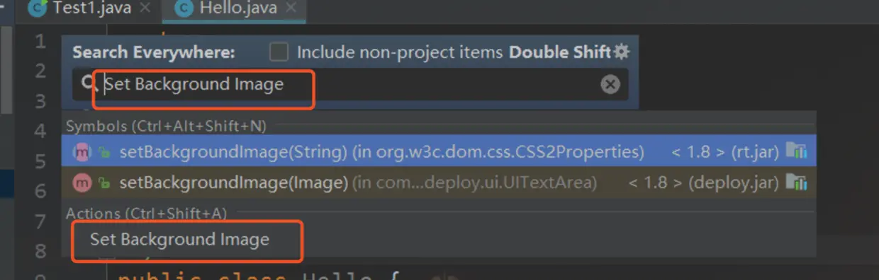 - 在idea中 双击shift 出现搜索框 输入: Set Background Image 单击 Set Background Image