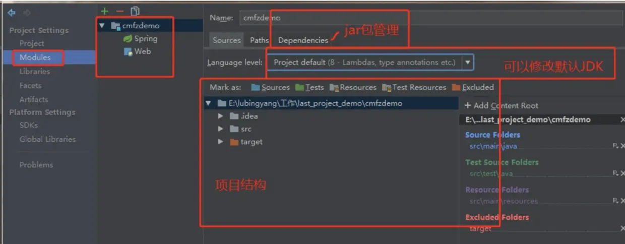 项目结构配置就是关于当前模块的配置,只对当前模块生效,例如Jar包,包结构,源码文件夹,输出路径,依赖和项目构建信息。