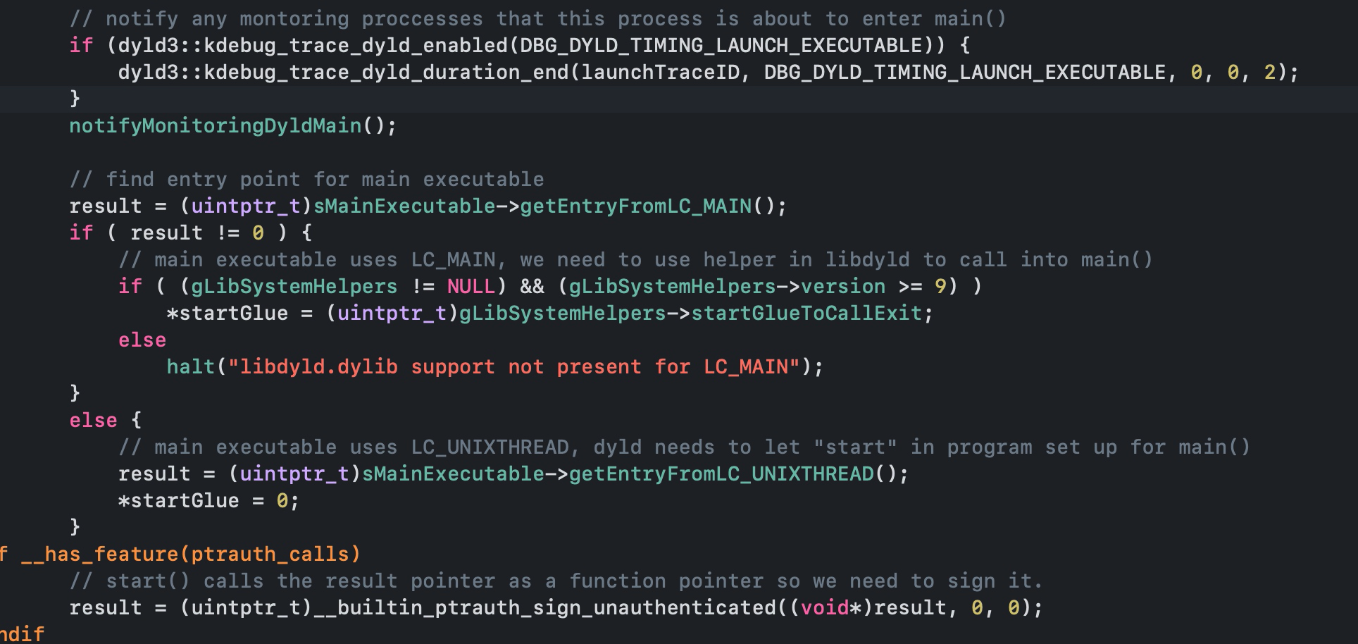 return dyld::_main(appsMachHeader, appsSlide, argc, argv, envp, apple, startGlue);