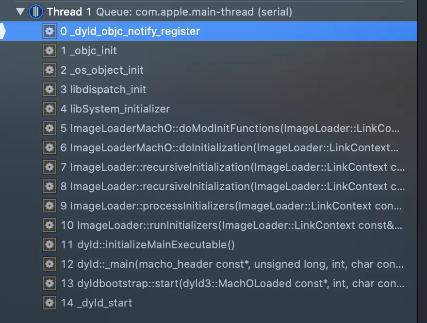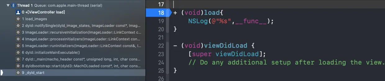 +load函数上下断点的函数调用栈,我们可以清晰的看到在+load函数之前执行的函数的调用情况。原来最开始的时候是从调用_dyld_start函数开始的。