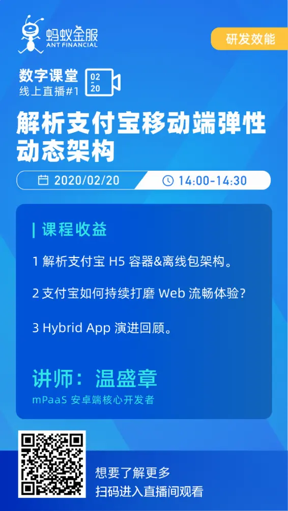 蚂蚁金服“共战‘疫情’,技术破局”数字课堂现火热直播中,资深专家从“云原生”、“研发效能”、“数据库”三方面分享蚂蚁金服的实践经验并在线答疑。今天下午,mPaaS安卓端核心开发者将带来《解析支付宝移动端弹性动态架构》的主题分享,让我们了解支付宝H5容器&离线包架构,持续打磨Web流畅体验的秘诀。