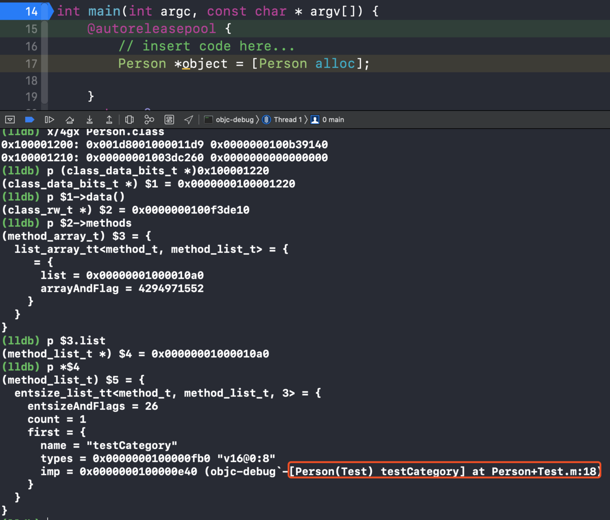 Person类以及分类都实现了+load方法,根据之前的分析在main函数之前通过lldb指令必然可以在类的rw里面查询到定义的testCategory方法。