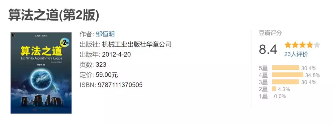 如果有人问学习算法有什么书籍可以推荐,那么《算法之道》一定必读不可。这本书第二版的豆瓣评分高达 8.4 。非常适合初学者。
