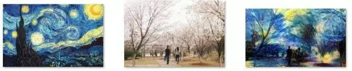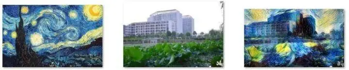 左边的图片是梵高的《星空》作为模板,中间的图片是待转化的图片,右边的图片是结果。